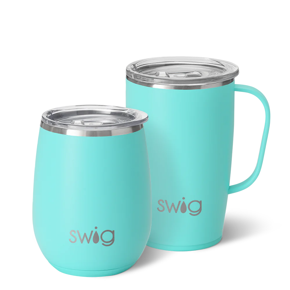 Start and finish your day with two of our best-selling Swigs. The Travel Mug will keep coffee hot through your commute, and then some! And the Stemless Wine Cup will keep your rosé perfectly chilled all evening long.