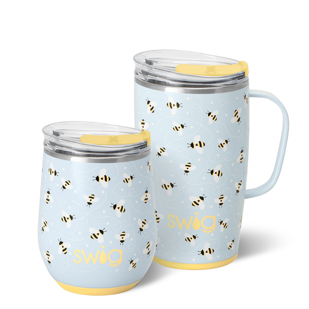 A set of Swigs for day and night! ☕❤️ Sweet as honey and cool as a breeze, this bumblebee design is a must-bee!