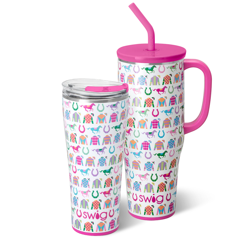 Bigger is better! Off to the races! Be Derby ready with colorful horses, jockey silks, and horseshoes racing across a shimmery white background.