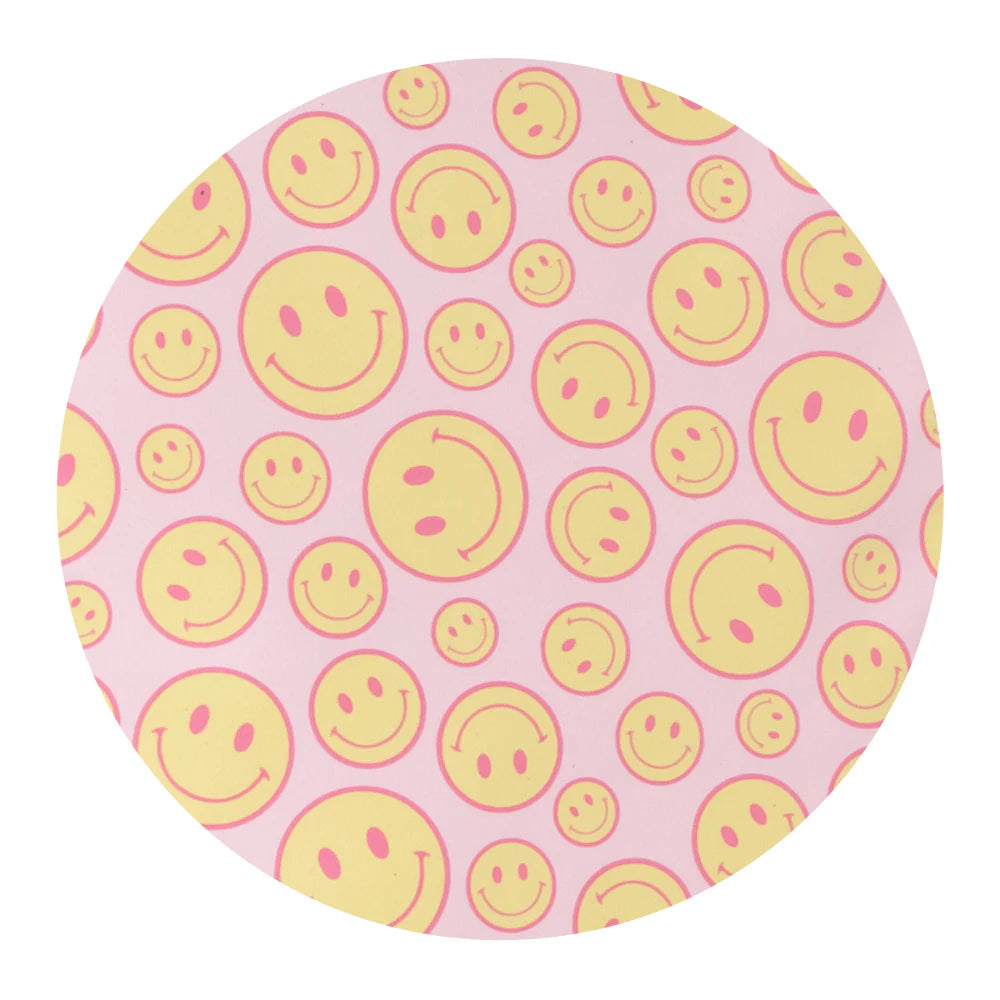 Lunch with style! 🥪 Have a cup of pick-me-up with this quirky collection of yellow smileys on a pale pink background.