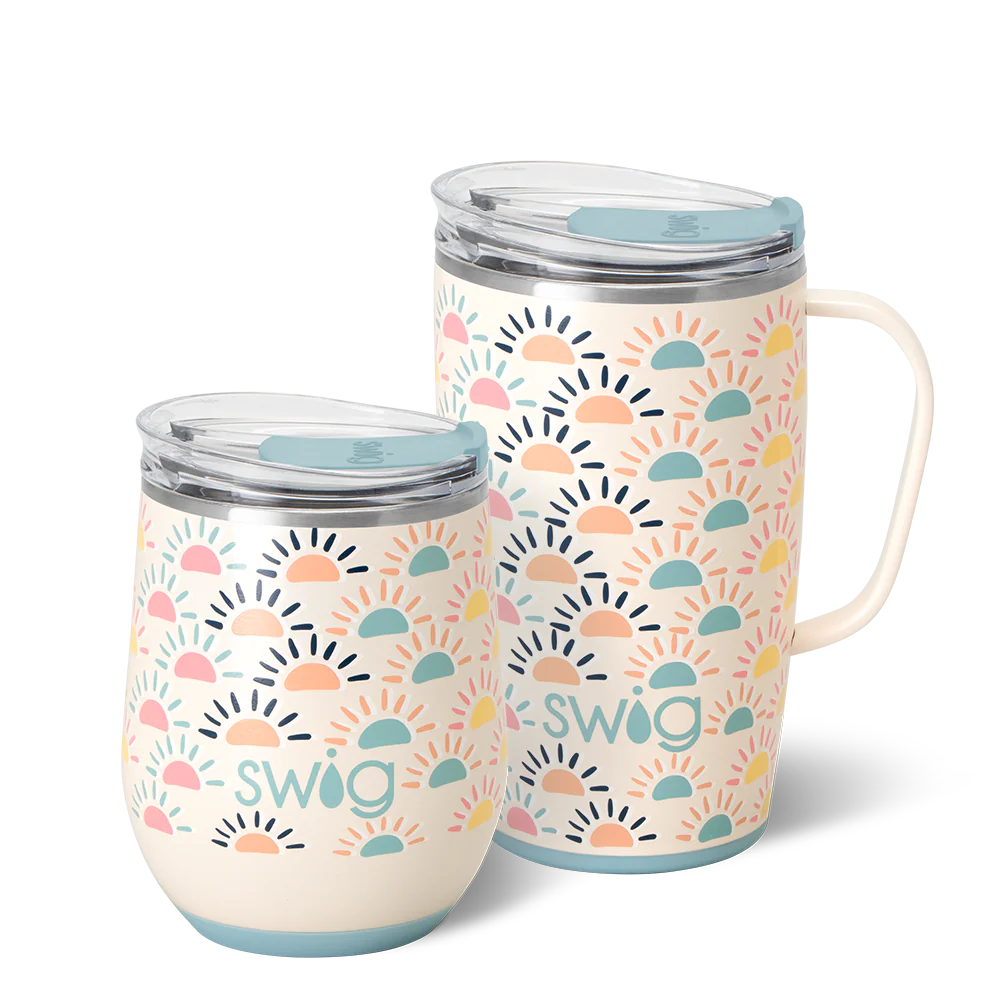 A set of Swigs for day and night! ☕❤️ Sip on sunshine with boho suns rising across a glitter background. ☀️