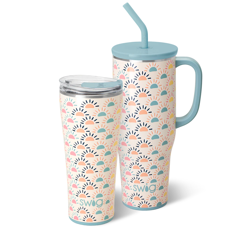 Bigger is better! Sip on sunshine with boho suns rising across a glitter background. ☀️